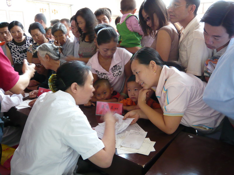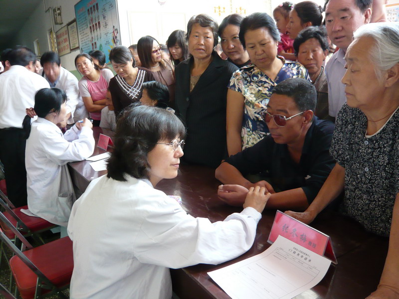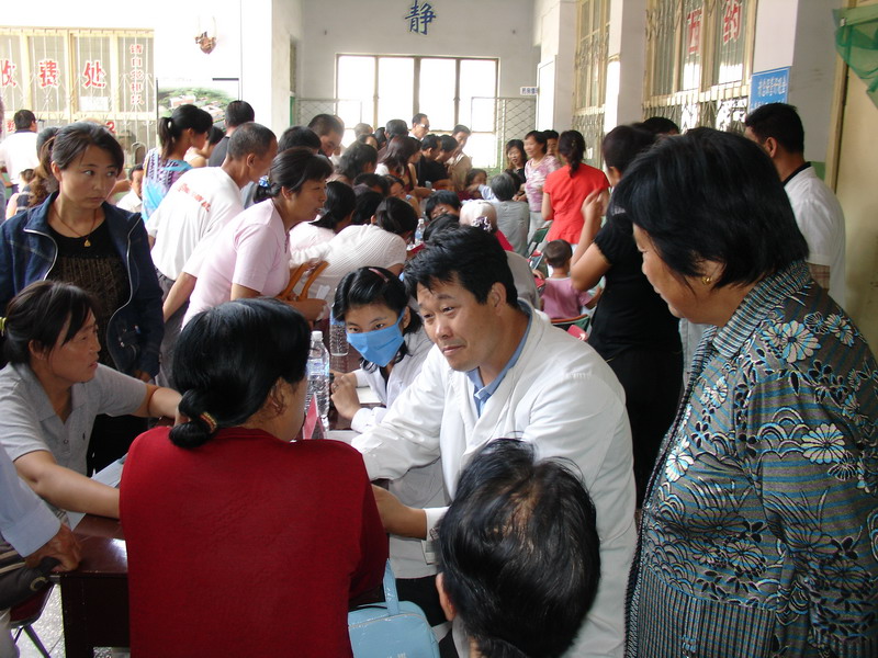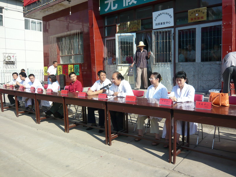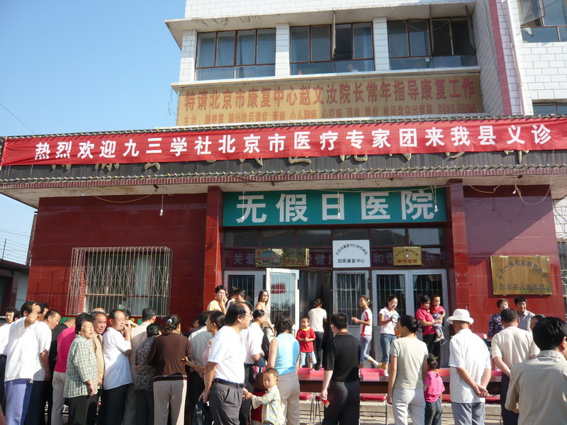 由我社北京大学第一医院支社主委、北大医院影像科王仁贵教授牵头,召集了北京大学医学部李安良教授、北大医院小儿内科梁卫兰教授、传染科陆海英教授、心脏内科马为副教授、胸外科赵虎副教授、影像科秦乃珊大夫、广安门中医医院麻醉科曹健荣主任医师、人民大学校医院神经内科张冬梅大夫和北京华信行陈春总经理,组成了医疗专家团,远赴河北省张家口市阳原县开展义诊活动。医疗专家团于8月10日抵达河北省张家口市阳原县,医疗专家团的到来受到了当地县政府有关领导、县医院有关领导和医院职工的热烈欢迎。阳原县孙莉副县长、阳原县医院王宏斌院长、闫向海副院长出席了欢迎仪式。王宏斌院长致欢迎词,他在致词中说:九三学社北京市委医疗专家团来到我们阳原县开展义诊和专业培训活动,是对我县医疗事业的最大支持。医疗专家团的各位专家不辞辛苦来到我县,为我县人民开展义诊活动,为我院医务人员进行培训,这种无私奉献精神,让我们十分感动。您们放弃了公休时间,来到我县开展义诊送温暖和送知识下乡活动,反映出九三学社各位专家关注社会、关注民生的高尚情操。您们的这种行为是对我县社会主义新农村建设事业最有力的支持。我们真心的希望与九三学社北京市委建立起长期合作关系,希望你们给予我们更多帮助和支持。